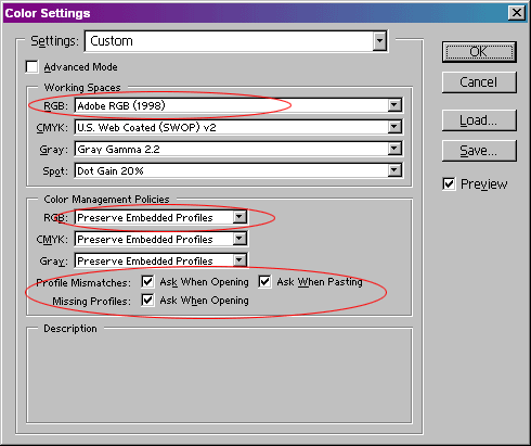 Following are recommended settings for Photoshop’s Color Settings dialog.