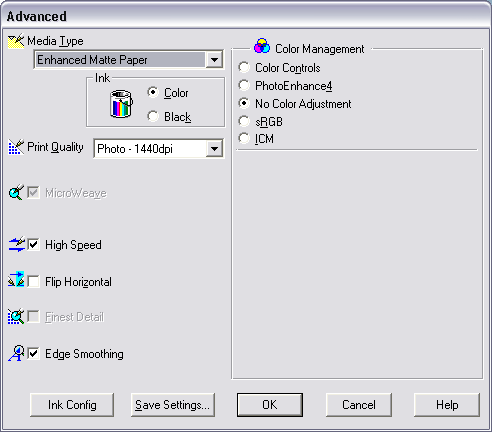 Follow these instructions when printing without individual ICC profiles. These instructions are appropriate for most Epson printers such as the 820, 890, 1270 and 1280/90 which do not come with individual paper profiles (at least, not on Windows).