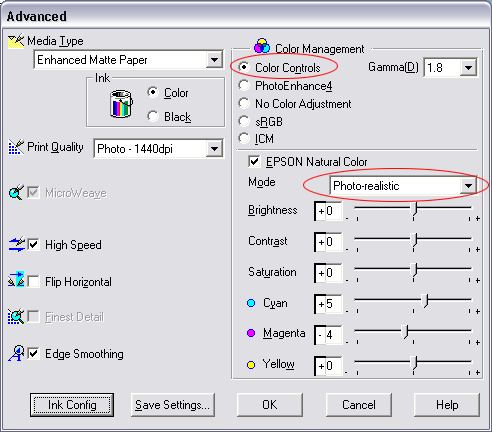 If your prints appear to have a color cast using this method you can try adjusting the printer’s color output. Instead of ICM or ColorSync in step 11 above, select Color Controls and then under Mode select Photo-realistic and adjust the color sliders.